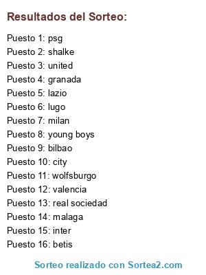 Lista de participantes: united, granada, city, valencia, young boys, wolfsburgo, malaga, betis, psg, real sociedad, bilbao, inter, milan, lugo, lazio, shalke.