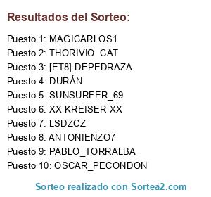 Lista de participantes: THORIVIO_CAT, SUNSURFER_69, LSDZCZ, ANTONIENZO7, MAGICARLOS1, PABLO_TORRALBA, XX-KREISER-XX, DURÁN, OSCAR_PECONDON, [ET8] DEPEDRAZA.