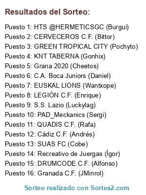 Lista de participantes: C.A. Boca Juniors (Daniel), CERVECEROS C.F. (Bittor), Cádiz C.F. (Andrés), DRUMCODE C.F. (Alfonso), EUSKAL LIONS (Wantxope), GREEN TROPICAL CITY (Pochyto), Grana 2020 (Cheetos), Granada C.F. (JMinrol), HTS @HERMETICSGC (Burgui), KNT TABERNA (Gonhix), LEGIÓN C.F. (Enrique), PAD_Meckanics (Sergi), QUADIS C.F. (Rafa), Recreativo de Juergas (Ígor), S.S. Lazio (Luckylag), SUAS FC (Cobe).