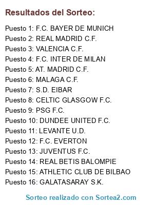 Lista de participantes: REAL MADRID C.F., F.C. INTER DE MILAN, DUNDEE UNITED F.C., S.D. EIBAR, REAL BETIS BALOMPIE, GALATASARAY S.K., MALAGA C.F., JUVENTUS F.C., VALENCIA C.F., F.C. BAYER DE MUNICH, ATHLETIC CLUB DE BILBAO, PSG F.C., CELTIC GLASGOW F.C., LEVANTE U.D., F.C. EVERTON, AT. MADRID C.F..