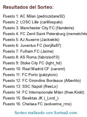 Lista de participantes: Stoke City FC (light_hd), Manchester City FC (Nandetre), Fulham FC (Jaime), AJ Auxerre (Jackiekiki), FC Zenit Saint Petersburg (memetchite7), FC Internacionale Milan (thee.Kiidd), FC Girondins Bordeaux (Albertito), AS Roma (fabriziod10), Besiktas JK (_Lord_), LOSC Lille (carlillospalo), Chelsea FC (wolverine_rms), Juventus FC (borjilla87), Real Madrid CF (varomt), SSC Napoli (ReeLo), AC Milan (pedrozidane92), FC Porto (patzytoro).