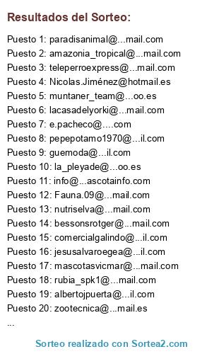 Lista de participantes: @Info, @vanessa, @azureus, @dnatecosistemas, @cue1211, @olga.recio, @pepe, @serrella2006, @mascoland, @paubonet, @elconejonet, @zootecnica, @pedro.pascual, @lorenagr.86, @Info, @torremascotas, @losreyesdemicasa, @Infoamazoonia, @hobbyzooalcobendas.lavega, @rubia_spk1, @guemoda, @teleperroexpress, @juformundoanimal, @m.a.r.i.a.23, @deltaquari, @mundoanimal06, @pepepotamo1970, @info, @albertojpuerta, @interzooguadalajara, @zooleon, @artepiedrajose, @aquarislinyola, @hzdiagonalmar, @supermercadocanino, @hobbyzoo.marineda, @murciamascotas, @interzooburgos, @cvfaycan, @estilcani, @junglasantander, @cvsauces, @faunatarres, @info, @az09___, @mesquemascotes, @tierraymarshop, @rarconada, @chiquiperros, @agricentrosalamanca, @sanxenzoo, @mundifauna, @mascotasdesestao, @e.pacheco, @erick-sandoval20, @mascotasvicmar, @crazyzoosantander, @david81garcia, @chinocaudete, @hobbyzoobaena, @animcugat, @info, @sansonmascotas, @compras, @agromascota, @harrycanpa, @agapro, @romifalbo, @paradisanimal, @faunauroboros, @comercial, @nuriacapicua, @amazonia_tropical, @floraifaunabenicassim, @hzvinaroz, @eltimbalpetshop, @tiendacomplementosyanimales, @piensosponce, @zamoraescudero, piensoslozano@hotmail,com, @Manuelsant78, @txakur-car, @Marionaturviva, @comercialgalindo, @santorojimenez, @tatepilo, @info, @mascota06, @jvnavero, @giraldospirata, @DANIELGOMILAPEREZ, @pinyacoon, @avichuchos.latiendadenoe, @nez, @sorayacanis, @info, @info, @perezfresneda, @cisasl, @naturzoo, @martaastur1996, @guaupelu, @lucena, @info, @info, @pbugallop2, @tomsus2002, @loski_89, @Dekkanmascotas, @leocanin, @Eugenioglezaguilar, @info, @Mascotes2010, @lunishamascotas, @sumartinezsaez, @nutriselva, @rivas, @txaka_3, @jesusalvaroegea, @soher93, @Delgoyepino2, @gestormascotas.NI, @mundomascotas, @wauwauoliva, @SAKATIA, @piensoseloina, @kelovean, @lauromascota, @Pequeozoo, @hobbyzooalcobendas, @Supergeorge30, @Pecunu, @jordi, @animalots, @CASADELAMASCOTAAVILES, @Ornitologia2006, @j.fernandez, @milabierzoo, @animcubelles, @becsipotes, @mascotasaya, @a.viguer, @animgava, @muntaner_team, @pbacuta, @info, @hobbyzooburgos, @p_trinos, @elgatopersa_100, @lacasadelyorki, @Gosfalder, @thays_83, @acuafaunasantander, @javier, @manolosalg, @Siluroteam, @anve2j, @Fauna.09, @stylegos, @interzooactur, @la_pleyade, @latiendadelosanimales, @info, @evasaludes, @antonioaceituno, @bessonsrotger, @merkanortedistribuciones, @patriciarequin, @rubiotuniet, @mimatumascota.