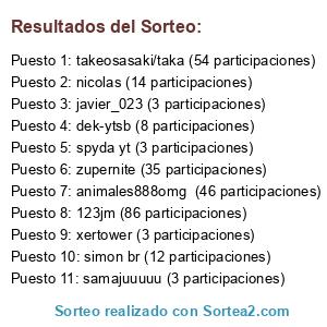 Lista de participantes: 123jm (86 participaciones), animales888omg (46 participaciones), zupernite (35 participaciones), nicolas (14 participaciones), simon br (12 participaciones), dek-ytsb (8 participaciones), xertower (3 participaciones), spyda yt (3 participaciones), javier_023 (3 participaciones), samajuuuuu (3 participaciones).