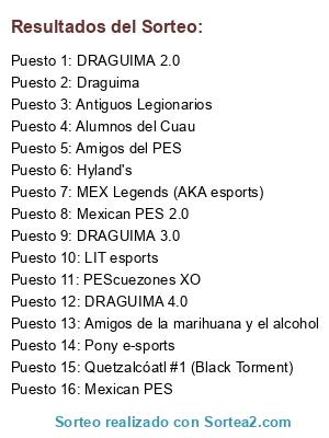 Lista de participantes: Pony e-sports, Alumnos del Cuau, Quetzalcóatl #1 (Black Torment), Antiguos Legionarios, Mexican PES, MEX Legends (AKA esports), Amigos del PES, PEScuezones XO, Hyland's, Mexican PES 2.0, Amigos de la marihuana y el alcohol, Draguima, LIT esports, DRAGUIMA 2.0, DRAGUIMA 3.0, DRAGUIMA 4.0.