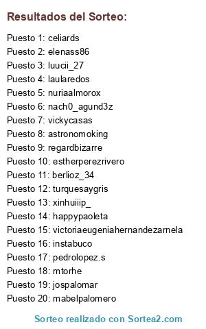 Lista de participantes: alfonsomartiniglesias, acastanon2020, jospalomar, elenass86, frank_meza2204, lumamo25, fernando0394, laularedos, mtorhe, nuriaalmorox, victoriaeugeniahernandezarnela, instabuco, pedrolopez.s, lydia_med, nach0_agund3z, menoti23_, spookyrulen, mariargas, happypaoleta, danielumayer, happypaoleta, celiards, vickycasas, celiards, turquesaygris, mamidedospeques._1723, regardbizarre, astronomoking, astronomoking, raquelag95, vanessacansecogimeno82, guadalupenaranjovega, steal69, laurafdez82, raul_snow10, berlioz_34, luucii_27, xinhuiiip_, mabelpalomero, titomsanz, estherperezrivero.