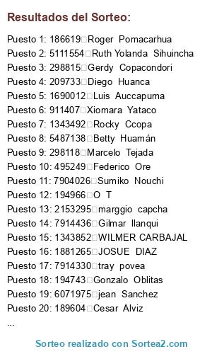 Lista de participantes: 184556 Julio Quintanilla, 185162 Juan Yunguri, 185166 Melany Carpio, 185179 Kevin Cervantes, 185686 Adriel Zuniga, 185928 Joaquin Casas, 186319 Ulises Igor Villena Casafranca, 186619 Roger Pomacarhua, 187010 Angel Jhonatan Manchego Urquizo, 187096 Liubing Bustamante, 187310 Mijael Apaza, 187473 Eddy Farfan, 188456 Jorge Franco, 189604 Cesar Alviz, 189642 jeremi caviedes, 189666 Jose Eduardo Follana Peralta, 191879 Hugo Pilco, 192348 Eduardo Lecaros, 193374 Katerin Ticuna, 194274 julio vega, 194294 Luis Escalante, 194573 Carlos Morales, 194743 Gonzalo Oblitas, 194751 Diego Fernando Ricra candia, 194754 Steven Roja, 194755 Jose luis, 194769 Lionel Gamarra, 194790 JEAN FRISANCHO, 194798 Juan Velarde, 194816 Jair Buitron, 194841 Jose Herrera, 194853 Antonio Matheus, 194862 Eitan Mollinedo, 194901 Yasmany Romero, 194965 Helder Huillca, 194966 O T, 194983 Henry Quispe, 195028 Vilma Quispe, 195095 Efrain Caceres, 195100 ROGER CCOLQQUE, 195203 Diego Angulo, 195211 Oscar Arley Rodriguez Carpio, 195597 edwin laura, 195649 Pamela Trelles, 195842 juan gonzales, 199525 Erick Ninan, 200833 Cristhian Axel Cari Cutipa, 201120 RUDY CANDIA, 203842 Pabel Sebastian Pena Tejada, 208612 Edinson Pujay, 209481 Yohana Pinzon, 209733 Diego Huanca, 231448 thomas sanchez, 237330 Jorge Arenas, 252857 Luis Almeida, 269211 Jesus Lopez, 276678 EDSON GALICIA, 296130 Adrian Pareja Abarca, 298055 Vladimir Huaricapcha, 298076 alvaro ramos, 298096 Yuri Hancco, 298100 Rijkar Segovia, 298103 Diego Cruz, 298118 Marcelo Tejada, 298160 Lucio Fernandez, 298206 Diego Quispe, 298227 WILBERTH LEVITA, 298229 Erick Erwins Andia Llamacponcca, 298248 Ronald Caballero, 298252 Kevin Surco, 298318 Alex Quico, 298323 Patrick Kluivert, 298367 Paul Mendoza, 298415 Bernardo Echegaray, 298454 Jhoel Champi, 298511 Witman Vargas, 298514 Willians Ccoyso, 298554 David Quispe, 298561 Cristhian Enriquez, 298565 Luz Tirado, 298572 Victor Guerra, 298606 Hedy Aguilar, 298607 RELY JUSCCA, 298736 Rodrigo Fabrizio Guillen Espinoza, 298815 Gerdy Copacondori, 298829 Alex Ccoyccosi, 298837 Edwar Sotelo, 298911 Elvis Gilberto Sandoval Laynes, 298990 Jorshy Mamani, 298993 Darwin Fabricio Huillca Abarca, 299080 Cristian Mosqueira, 299103 Valerio Quispe, 299262 Juan Cusipaucar, 299522 Jose angel Tito montalvo, 299631 Luis Castelo, 299682 Victor Lozada, 299763 Rolando Oquendo, 299789 Arnold Villena, 300075 Samuel Ticona, 300166 Jair Manaccasa Condori, 300480 Cristhian Paucar, 300548 Ricardo Huamani, 305310 rene guzman, 307200 Guido Torres, 307962 ALDO CABALLERO, 308397 Juan Holguino, 308672 Kevin Cabana, 308989 Diego Gonzales, 310362 sthiago quintanilla, 311206 Edison Huallpa, 315945 Carlos Enrique Fernandez Fernandez, 316139 Gonzalo Elvis Zuniga Huillca, 326799 anita milagros montalvo tacuri, 340630 Jhon Enriquez, 411162 Raul Alejandro Diaz Alva, 412312 Marco Bellota, 412389 Edwin Ffoccore, 415731 Franco David Chunga Chunga, 430834 Isaa Laura, 434521 Renzo Terrazas, 435525 Jose Ccoto, 457308 Luis Vargas, 460059 Diego Montoya, 469379 Carlos Mamani, 476258 diego esquivel, 477248 Luis Davila, 478571 JOSUE BAENZ, 479328 ALEX MAKENSY QUISPE LLANOS, 483219 Jose Apaza, 486200 Pamela Segovia, 491648 Jose Araujo, 493388 Denilson Lingan, 494663 Jose Carlos Fachin Munares, 495249 Federico Ore, 524480 Jose Ramirez portocarrero, 550010 hector luis diaz quispe, 563513 Marcio Espinoza, 568781 Kevin Pedro Perez Garcia, 581741 Bryan Cesar Cayllahua Chambi, 607169 Wilmer Rubio, 648420 JOSE ALBERTO BELLODAS YAJAHUANCA, 669537 JESUS MOJONERO, 686658 Victor Hinostroza, 739096 William Quispe, 764047 Miguel Deza, 799834 Carlos Incaroca, 817709 Alex ttito, 841513 Cristhian Uscapi, 844622 Américo Aymachoque, 911407 Xiomara Yataco, 929440 JUAN Diego Tineo Aparcana, 976153 Gianmarco DelPiero Alcántara Pereda, 1090851 Jarol Chirinos, 1147520 Nick Samata, 1281053 Diego MARCELO NINAN MOLINA, 1318220 hectro castillo, 1343270 Piero Saman, 1343282 Joel García, 1343291 Patricia Ortega, 1343297 Yeferson Caceres, 1343306 Jose Olivera, 1343336 Jerson Alvarez, 1343345 Ricardo Arana, 1343348 Jhoe Sarmiento, 1343351 Diether Wilson, 1343396 Fredy Monzon, 1343399 Dennis Huaman, 1343423 Jean Huayotuma, 1343438 rodrigo yuca, 1343444 Cristian Villena, 1343468 Gerardo Farfán, 1343492 Rocky Ccopa, 1343495 Edwin Sarmiento, 1343507 Edison Lezama, 1343519 Almendra Arce, 1343525 Omar Castillo, 1343546 Omar Castillo, 1343576 Nicole Roman, 1343609 Michael Leiva, 1343627 Juan Huaman, 1343654 Edwar Quispe, 1343675 Andrea DeLaTorre, 1343723 Danitza Zuniga, 1343732 Fabian Zúñiga, 1343768 Henry Gonzales, 1343810 James Jincho, 1343837 Jean Benito, 1343843 Sebastian Guevara, 1343852 WILMER CARBAJAL, 1343879 Luis Jordan, 1343924 Huaman Challco, 1343978 Yamile Parra, 1344050 Adrian Gongora, 1344065 Edir Castillo, 1344125 Julio Valdivia, 1344137 gianmarco jimenez, 1344275 Jaqueline Montesinos, 1344299 Yuri Pereira, 1344392 Abraham Salguero, 1344452 Diego Montesinos, 1344506 jorge pedraza, 1344509 Sebastian Vega, 1344569 Jose Vilca, 1344575 Laura Dolmos, 1344659 Carmen Enriquez, 1344743 Jhon Masias, 1344977 Jhaspel Chujutalli, 1344992 Dussan Benavente, 1345022 Julio Arellano, 1345046 Quispe Quispe, 1345184 Michael Miranda, 1345265 Alexandro Socualaya, 1345403 Edson Muñiz, 1345511 Stefano Oroz, 1345556 Juan Ñaupa, 1345571 Favio Kjarol Salazar Chacon, 1345919 Israel Condori, 1346012 Nery Carazas, 1346297 Ronald Quispe, 1346627 Stefano Choquetinco, 1346735 Jeremmy Contreras, 1346768 Aldair Alvarez, 1346942 Jose Taipe, 1347047 Cliver VILCHEZ, 1347095 Dennis Condori, 1347221 Yeferson Alvarez, 1347263 Jhonatan Farfan, 1347299 Sebastian Zans, 1347737 Mario Huamani, 1347944 SILVESTRE QUISPE, 1348172 Lucero Unda, 1348424 Eileen Surco, 1348763 Juaquin Abarca, 1348844 Julio Marquez, 1350395 Jhon Condori, 1350944 Santiago CUSI, 1351445 Javier Eduardo Gutiérrez Yepez, 1367408 Alejandro Juchasara, 1387562 Juan Suarez, 1387589 Dony Esteban, 1387601 Italo Huerta, 1387649 Roger Chile, 1387715 aldair huaman Qui