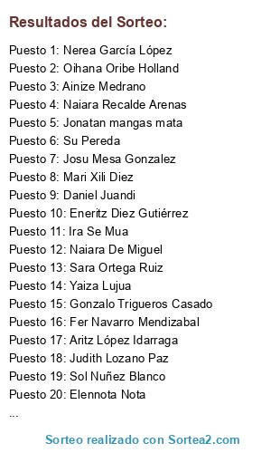 Lista de participantes: Sara Ortega Ruiz, Asier Torre Navrro, Felipe Ballestero de Miguel, Silvia Echevarria, Gonzalo Trigueros Casado, Elennota Nota, Fer Navarro Mendizabal, Estibaliz Rodriguez, Maitane Iturrate, Toño Valdivieso, Jon Sanmartin, Zuriñe Bidaurreta Miguel, Elizabeth Villamor, Naiara De Miguel, Julius Lázaro, Amets Díaz Regúlez, Josu Mesa Gonzalez, Maria Agr, Amalia Rodríguez, zaloa Bilbao puertas, Ana Lazaro, Eztizen Umaran, Alba Sasia Jjaa, Beatriz Alias Vasallo, Javier Aldana, Endika González Prado, Yaiza Lujua, Cristalmotor Glass Talleres Lunas Automovil, Ainhoa Garnil Gómez, Jose Antonio Josean Cinos, Leonor Uriarte Ibarrondo, Pá Zión, Soro Etxebarria, Arantza Otamendi Gomez, Sheila Gonzalez, Nerea García López, Guillermo Bilbao Torrontegui, Mikel Diez Martinez, Sol Nuñez Blanco, Felix Zulaica, Jon Peña Leizea, Mai Landaluze Olabarria, Itziar Martínez, Yvan González, Inmaculada Lozon Ochoa, FERNANDO VALLEJO CARRASCO, Rubens Malkovich, Marta Tato, María Armesto Zubero, Jonatan mangas mata, Javivi Mallagaray, Ainize Medrano, Jon Minguito, Ariane Olivencia González, Raquel Martinez, Ira Se Mua, Javier Marcos Barquin, Naiara Recalde Arenas, Juan Calabozo, Aritz López Idarraga, Oscar Garro Gutierrez, Eneko Muñoz Monroy, Nerea Eriz, Maria Aztiria, Laia Sistachs, Ivo Valadares, Germán Rubio, Ziortza Azpiazu Alonso, Celia Costela, Eneritz Diez Gutiérrez, Alba Márquez Rodríguez, Txali Txalinas, Leire González Redondo, María Lázaro Pajares, Itziar Araiko Calvo, Laura García Llamas, Ander Benito, Monica Ortega, Daniel Juandi, Su Pereda, Martín Caro, Monica Prieto, Nahia Zeta, Irune Saiz, Amagoia Rekero Garcia, Inge Saez, Elena Manso, Mari Xili Diez, Oscar del Hoyo, Marta Bermu, Olatz Sanchez Meruelo, Zuriñe Ortega Rogel, Oihana Oribe Holland, Sonia Romero Moreno, Taide Arteta, Bruno de Zabala Cano, Judith Lozano Paz, Xenia R. Merino, Aida Aidona, A Martin Moreno, Aída Martínez Bidaurrazaga, Asier Ramos Pérez, Mikel Castro García, Azahara Chamizo, Jani Otero.