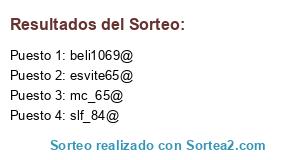 Lista de participantes: sergiromano@ , beli1069@ , naupolin@ , ivanromanofernandez@ , sonsoce@ , jaimeandres70@, laiamillas_89@ , selectiva7@ , lapekosilla69@ , isabelcanolopez@, elisabetpique@ , delgadoboloix@ , sabate.xell@ , camposev@ , evabernatpujol@ , nipaca@ , rosetafalco@ , weke-weke19@ , estherag2009@, mireia.buchaca@, juserca@ , carmebetriu@ , cipri_ana@ , pramos321@ , esvite65@ , sonsoce3@ , raquead@ , adrianrubia17@ , mickymiquelet@ , martagar75@, yaral27@ , isa.salguero@, esfoga@ , pinepa@ , n_garcia_75@ , victor.cabestanyriu28@ , rsevillalopez@ , laureta_38@ , paquineco@ , evalls40@ , nucatot@ , fj.bonilla@ , titutonrai@ , nessbel@ , cristinalliuro@ , susana_charles@ , wrcorsa@ , lorenaguilariene@ , pep.121968@ , spiolets@ , maribelroyo@ , raqueltp25@ , isa-caracol@ , analu_1329@ , atodacapel@ , cocoloco00@ , yolanda.alonso.garcia@ , Chelvelez1988@ , avilajosana@ , jormelis11@ , mapuga90@ , mmarilo18@ , mjlq74@, jonatanmartinez@ , jordiseguracastellvi@ , jcarlos.mollet@ , annabel5373@ , rosariba@ , marcosalonso1975@ , damartani@ , jonault.tg@ , joan@, sonera@, mccabrera52@, lilian.lobo@ , danijusa@ , carlescalvo@ , trivi69@ , rosiadan@ , gloriabp66@ , estremis@ , syaiza21@ , pfa_10@ , papitaju@ , sabaterrebeca@ , slf_84@ , jcodinar@ , carrili1@ , romera15@ , jamargobarna@ , aniblo2@ , compras@, mc_65@ , leoarcosmaldonado@ , colladoyolanda@ , rufinalopezsf@ , mariadelvalle_9@, oscar2maki@ , xexu1234@ , ingridlr234@ , irenerumis@ , jose-34a@ , codinajordi@ , cayestemus@ , mturne@, alopez@, familiafervi@ , gemmasanzlopez@ , harrylambert1976@ , alba.berengueras@ , vicramirez_c8@ , vanesa.sanchez.conesa@ , danielfernandeztorres@ , jnerin67@ , joseluisfons@ , albertrodriguezflorensa@ , anna.serra88@ , raulgarciataboada@ , rubitaa1980@ , rubitajpd@ , thebarricuda@ , jmdiaz9@ , janbiang@ , xavi.llunell@ , djkomos@ , isratorres9@ , albert_rubi@ , tank_gs@.