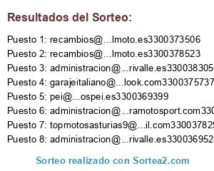 Lista de participantes: @RAUL, @topmotosasturias9, administracion@...rivalle.es3300380965, administracion@...rivalle.es3300369521, administracion@...rivalle.es3300370300, administracion@...ramotosport.com3300364467, @recambiosdiraba, recambios@...lmoto.es3300373506, recambios@...lmoto.es3300378523, recambios@...lmoto.es3300362528, @cristianbarea27, @garajeitaliano, pei@...ospei.es3300369399, administracion@...rivalle.es3300383056, info@...otris.es3300376197, @francoismanso, administracion@...rivalle.es3300384533, info@...osport2000.com3300385031.