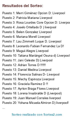 Lista de participantes: Joselo Ortellado D ) liverpool, Yohana Micaela Almiron D) liverpool!, Lorena Insabralde D (Liverpool), Ana Laura Sosa D) Liverpool., Martin Masx Liverpool, Tatiana Mariángel Osuna d) Liverpool, Luciia Rios d) Liverpool, Maar Bazante Carp Liverpool, Sebastián Raggi Liverpool, Patricia Román Liverpool, Claudia Miranda Liverpool, Adara Fernández Liverpool, Mariana Morell Liverpool, Mechy Espinoza Liverpool, Juan Manuel Corrales liverpool, Rosana Flores Lopéz Liverpool., Lau Zimmerli Luque D. Liverpool, Sebastian Echavarria Liverpool, Florencia Salinas D- Liverpool, Melii Pomares D- liverpool, Sol Salinas D- Liverpool, Marisa Campodonico D .y tengo un hambreeee x ganar laa entradas, German Y. Marty Smieth Liverpool, Gerónimo Salinas D- Liverpool!!, EsteLita AyaLa d) Liverpool, Rosa Lourdes Core Opcion D: Liverpool, Teyha Maidana D- LIVERPOOL, Rox Borda Liverpool, Gustavote Nuñez Liverpool, Ayrton Braga Flores Liverpool, Sebas Gamarra d) Liverpool, Juan Carlos Liverpool!, Melli Gonzalez Respuesta opcion d) Liverpool, laura Almiron Liverpool, Arq Noemi Samudio liverpool, Anyelike Alca D, Patricia Mariana Liverpool, María Trofelli d) Liverpool, Merr Maloriz Liverpool, Merri Giménez Opcion D: Liverpool, Bruno Marcelo Di Giuseppe d) Liverpool, Tere Revidatti Liverpool, Marisa Campodonico Liverpool, Flory Turza "D", Leonardo Fabian Fernandez La D!, Facundo Esquivel D, Ricardo Antonio Ratti d ., Adrian Benitez Castillo D, Anibal Quiroz D, Adrian Aguirre d, Mercedes Sandoval LA "D", Analia Marisel Castillo D, Adrian Torres D !!!!!!, Graciela Ramirez D !!, Maguii Alegre Liverpool, Silvana Ceballos Dioverti D !!!, Lusiana Quin D ) liverpool, Daniel Medina Liverpool, Adrian Rodriguez liverpool!, Jose Acosta liverpool, Nicko Mascazzini D liverpool, Belen Gonzalez Liverpool, Jani Celeste D) Liverpool, Alis Ayala D, Debora Galarza Alcaraz D, Clarita Magdalena Alegre d) liverpool, Milagros Díaz Colodrero Liverpool, Sofi Villanueva D: Liverpool, Soledad Frette liverpool!, Laura Guilio La respuesta es la D.
