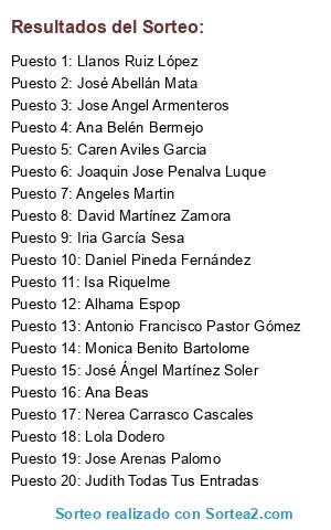 Lista de participantes: Mary Campuzano, Nerea Carrasco Cascales, Ismael Martínez Nicolás, Ana Beas, Iván T García, Raul MoBe, Lola Dodero, Caren Aviles Garcia, Pedro J García, José Ángel Martínez Soler, Macarena Marti Ceballos, Aleksandra Kudryk, Francisco Javier Ruiz Igualada, Amanda Martínez Navarro, Iria García Sesa, Alhama Espop, Crystel Ibáñez Quinn, Amparo Vñ Cndl, Joaquin Jose Penalva Luque, Isa Riquelme, Antonio Francisco Pastor Gómez, Violeta Villanueva Aguilar, Judith Todas Tus Entradas, Quique Cabezas Valero, Álvaro Cussac, Juan Jose Gonzalez, David Martínez Zamora, David Hortal Romera, Cristina HG, Entre Telas Isabela, Nachito Arcuri, Jose Angel Armenteros, Virginia Pujante Pastor, Ana Belén Bermejo, Carmen Saura, Vanessa Hurtado, Mari Carmen Fernandez Calvache, Roman Ca Si, Rubén Bernal, José Abellán Mata, Alba González Valdelvira, Cintia García Sáez, Carlos Javier Cárceles Hernández, Rodi Cases Gomez, Daniel Pineda Fernández, Francisco Jose Lopez Muñoz, Alicia Ruiz, Angeles Martin, Rosalía Zapata Rubio, Marta Simón Hernández, Llanos Ruiz López, Isbel Ita, Monica Benito Bartolome, Jose Arenas Palomo.