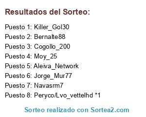 Lista de participantes: Cogollo_200, Aleiva_Network, Jorge_Mur77, Killer_Gol30, Moy_25, Bernalte88, Navasrm7, Peryco/Lvo_vettelhd *1.