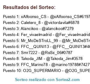Lista de participantes: Fer_vivaelmadrid - @Fer_vivaelmadrid#2232, O2G_SUPERMARIO - @O2G_SUPERMARIO#3949, Smr7222 - @RαSє_06#0787, FFC__QUINI13 - @FFC__QUINI13#4654, Alancikoo - @alancikoo#7279, Caletero_8 - @victordavila#6878, xAlfoonso_CS - @xAlfoonso_CS#6197, Mr_MoDeSTroLL_99 - @Mr_MoDeSTroLL_99#6478, FFC_Marino78 - @marino19788#7427, Takoda_JIM - @Takoda_Jim#3578.