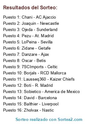 Lista de participantes: Balthier - Liverpool, Chani - AC Ajaccio, Joaquin - Newcastle, Danzare - Ajax, Ojeda - Sunderland, Lausseq360 - Kaizer Chiefs, Zidane - Getafe, David - Barcelona, Oscar - Betis, Pezu - At. Madrid, Sobietico - America de Mexico, Boti - R. Madrid, Zholvax - Nastic, Borjals - RCD Mallorca, LoPeina - Sevilla, 7SCImports - Celtic.