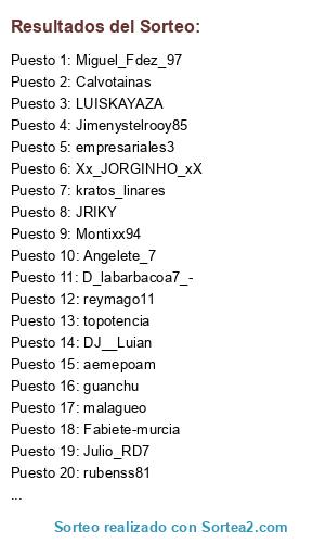 Lista de participantes: kratos_linares, Miguel_Fdez_97, guanchu, Fabiete-murcia, barroso_ceuta, Xx_JORGINHO_xX, aemepoam, LUISKAYAZA, Calvotainas, rubenss81, sefis_10, Ceutito, Jimenystelrooy85, DJ__Luian, JRIKY, empresariales3, D_labarbacoa7_-, Ultimatejuanma, Julio_RD7, honda_ipr_civic, NisteR, topotencia, JuanmaZero, Montixx94, malagueo, Angelete_7, Kamikaze, reymago11.
