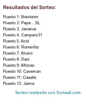 Lista de participantes: Acid, Campero31, Alvaro, Brainismr, Casells, Caveman, Pepe....SL, Alfonso, Romeritto, Dani, Jaime, Javierux.