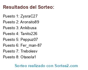 Lista de participantes: Ankibusa, ZysraC27, Peppuz07, Aronsito89, Tanito226, Otasola1, Fer_man-87, Trebolesv.