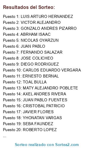 Lista de participantes: YHONATAN VARGAS, SEBASTIAN ALONSO FAUS, ERNESTO BERNAL, FELIPE QUINTEROS, SEBA FAUNDEZ, CARLOS EDUARDO VERGARA, AXEL ANDRES RIVERA, DIEGO RODRIGUEZ, NICOLAS OYARZUN, JAVIER FLORES, NIKOLOKOLINO MORALES, FERNANDO SALAZAR, MATY ALEJANDRO POBLETE, GONZALO ANDRES PIZARRO, JUAN PABLO, TOAL BULLA, CRISTOBAL PATRICIO, VICTOR ALEJANDRO, CHRISTOPER ALEXIS, ROBERTO LOPEZ, JOSE COLICHEO, LUIS ARTURO HERNANDEZ, JUAN PABLO FUENTES, ABRHAM ISAAC.