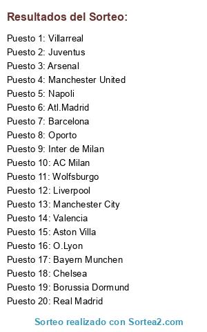 Lista de participantes: Real Madrid, Barcelona, Atl.Madrid, Villarreal, Valencia, Arsenal, Aston Villa, Manchester United, Manchester City, Chelsea, Liverpool, Inter de Milan, AC Milan, Napoli, Juventus, Bayern Munchen, Wolfsburgo, O.Lyon, Borussia Dormund, Oporto.