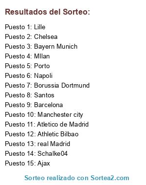 Lista de participantes: real Madrid, Barcelona, Manchester city, Chelsea, MIlan, Bayern Munich, Atletico de Madrid, Borussia Dortmund, Porto, Napoli, Lille, Schalke04, Ajax, Santos, Athletic Bilbao.