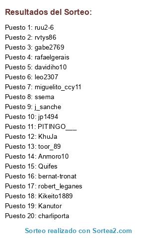 Lista de participantes: leo2307, rvtys86, davidiho10, ruu2-6, charliporta, toor_89, KhuJa, Kanutor, Kikeito1889, PITINGO___, Anmoro10, bernat-tronat, ssema, miguelito_ccy11, jp1494, robert_leganes, Quifes, gabe2769, rafaelgerais, j_sanche.