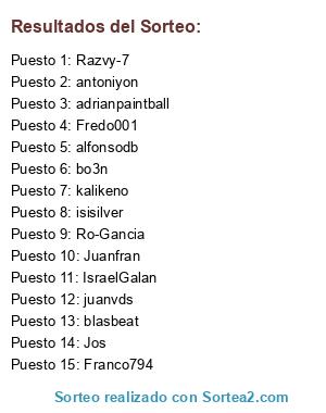 Lista de participantes: IsraelGalan, Jos, Ro-Gancia, Razvy-7, Fredo001, Juanfran, Franco794, alfonsodb, bo3n, kalikeno, adrianpaintball, blasbeat, juanvds, isisilver, antoniyon.