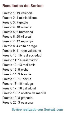 Lista de participantes: 1 atletic bilbao, 2 atletico de madrid, 3 osasuna, 4 celta de vigo, 5 elche, 6 barcelona, 7 getafe, 8 granada, 9 levante, 10 malaga, 11 rayo vallecano, 12 espanyol, 13 real betis, 14 real madrid, 15 real sociedad, 16 valladolid, 17 sevilla, 18 almeria, 19 valencia, 20 villareal.