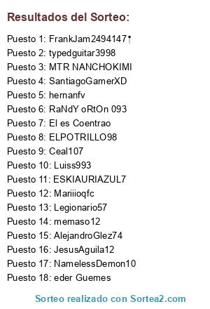 Lista de participantes: NamelessDemon10, Ceal107, AlejandroGlez74, ELPOTRILLO98, RaNdY oRtOn 093, Mariiioqfc, ESKIAURIAZUL7, El es Coentrao, typedguitar3998, JesusAguila12, hernanfv, SantiagoGamerXD, eder Guemes, MTR NANCHOKIMI, Luiss993, FrankJam2494147 , memaso12, Legionario57.