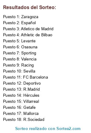 Lista de participantes: FC Barcelona, R.Madrid, Villarreal, Valencia, Español, Athletic de Bilbao, Atletico de Madrid, Sevilla, R.Sociedad, Getafe, Mallorca, Sporting, Hércules, Deportivo, Zaragoza, Osasuna, Racing, Levante.