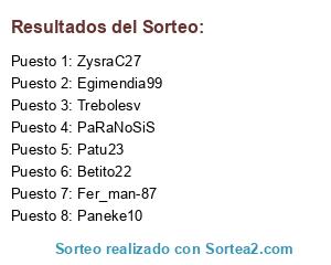 Lista de participantes: Betito22, Patu23, PaRaNoSiS, Paneke10, Egimendia99, Fer_man-87, ZysraC27, Trebolesv.