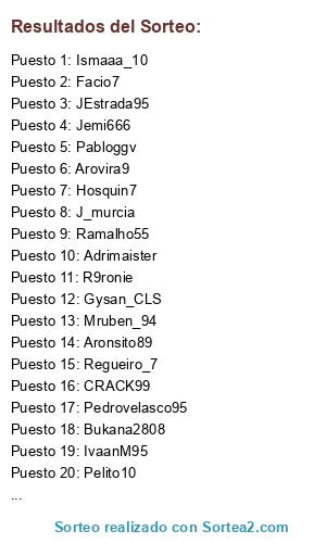 Lista de participantes: Juangutierrez91, Isma123i, CRACK99, Danieliyo10, Assasinstoto, Pabloggv, IvaanM95, Facio7, Ramalho55, J_murcia, JEstrada95, Hosquin7, Gysan_CLS, Pelito10, R9ronie, Furru_asesino21, Arovira9, Pedrovelasco95, Locobielsa89, Ismaaa_10, Nava_21_, Ergoncho, Ankibusa, Pelizelli, Jemi666, Abraham_2210, Bukana2808, Aronsito89, Regueiro_7, Enyalion, Adrimaister, Mruben_94.