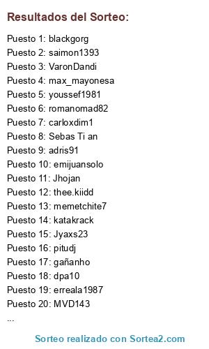 Lista de participantes: jorgetkd, varomt, Jaime, dpa10, blackgorg, monto rs, xFearlessY, Ajnoi, mono80, carloxdim1, thee.kiidd, Pabliiin, Xavi, Fran94, ismajimva, romanomad82, pitudj, ega_david, erreala1987, juampi, Kolorin, adris91, Wolverine_rms, carlillospalo, memetchite7, Julio, saimon1393, superuce, emijuansolo, Jhojan, Sebas Ti an, julianhr, gañanho, VaronDandi, katakrack, max_mayonesa, juniorcodema, Jyaxs23, MVD143, youssef1981.