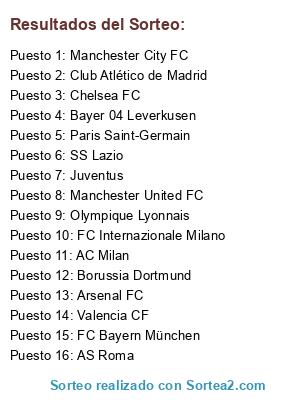 Lista de participantes: Real Madrid CF, FC Barcelona, Club Atlético de Madrid, Valencia CF, Sevilla FC, Villarreal CF, Manchester City FC, Manchester United FC, Tottenham Hotspur FC, Liverpool FC, Chelsea FC, Arsenal FC, FC Bayern München, Borussia Dortmund, Bayer 04 Leverkusen, Juventus, SSC Napoli, AS Roma, FC Internazionale Milano, SS Lazio, AC Milan, Paris Saint-Germain, AS Monaco FC, Olympique Lyonnais.