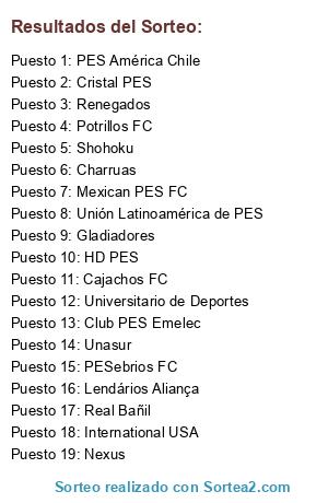 Lista de participantes: Cajachos FC, Charruas, Club PES Emelec, Cristal PES, Gladiadores, HD PES, International USA, Lendários Aliança, Mexican PES FC, Nexus, PES América Chile, PESebrios FC, Real Bañil, Renegados, Shohoku, Unasur, Unión Latinoamérica de PES, Universitario de Deportes, Potrillos FC.