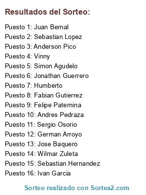 Lista de participantes: Andres Pedraza, Sergio Osorio, Felipe Paternina, Jose Baquero, Fabian Gutierrez, German Arroyo, Wilmar Zuleta, Humberto, Juan Bernal, Sebastian Hernandez, Jonathan Guerrero, Anderson Pico, Vinny, Simon Agudelo, Ivan Garcia, Sebastian Lopez.