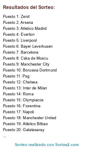 Lista de participantes: Bayer Munich, Bayer Leverkusen, Borussia Dortmund, Shalcke04, Ac Milan, Inter de Milan, Napoli, Roma, Fiorentina, Juventus, Real Madrid, Barcelona, Real Sociedad, Valencia, Atletico Bilbao, Atletico Madrid, Arsena, Chelsea, Everton, Manchester United, Manchester City, Liverpool, Galatasaray, Zenit, Cska de Moscu, Psg, Monaco, Olympiacos, Benfica, Oporto, Sporting de lisboa, Ajax.