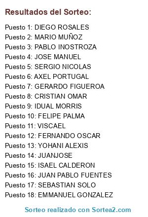 Lista de participantes: IDUAL MORRIS, SEBASTIAN SOLO, PABLO INOSTROZA, VISCAEL, YOHANI ALEXIS, EMMANUEL GONZALEZ, AXEL PORTUGAL, JUANJOSE, FELIPE PALMA, MARIO MUÑOZ, SERGIO NICOLAS, JUAN PABLO FUENTES, JOSE MANUEL, ISAEL CALDERON, FERNANDO OSCAR, GERARDO FIGUEROA, CRISTIAN OMAR, DIEGO ROSALES.