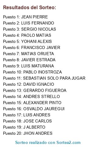 Lista de participantes: JOSE CARLOS, DAVID IGNACIO, YOHANI ALEXIS, SERGIO NICOLAS, J ALBERTO, JEAN PIERRE, FRANCISCO JAVIER, ANDRES STRELLO, JHON ANDRES, LUIS MATURANA, OSVALDO JAUREGUI, SEBASTIAN SOLO PARA JUGAR, ALEXANDER PINTO, MATIAS ORUETA, PAOLO MATIAS, LUIS FERNANDO, GERARDO FIGUEROA, JAVIER ESTRADA, PABLO INOSTROZA, LUIS ANDRES.