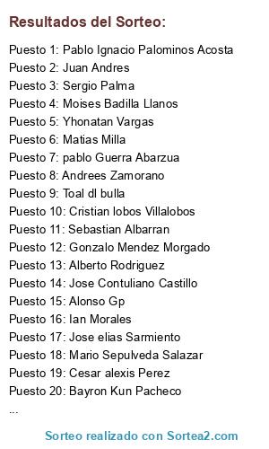 Lista de participantes: Marcelo Valle Alarcon, Juan Pablo, Alberto Rodriguez, Pablo Ignacio Palominos Acosta, Diego Rodriguez, Ian Morales, Andrees Zamorano, Moises Badilla Llanos, Alonso Gp, Yhonatan Vargas, Gonzalo Mendez Morgado, Sebastian Albarran, Jose Contuliano Castillo, Mario Sepulveda Salazar, Sergio Palma, pablo Guerra Abarzua, Jose elias Sarmiento, Matias Milla, Bayron Kun Pacheco, Cesar alexis Perez, Juan Andres, Cristian lobos Villalobos, Toal dl bulla, Fernando Aguilera Nuñez.
