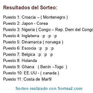 Lista de participantes: Australia ( nueva zelanda ), Belgica :p :p :p, Rep Checa - eslovaquia, Polonia - ( suiza ), EE.UU - ( canada ), Costa de Marfil, Chile ( Peru - Bolivia ), Marruecos y norte de afirca, irlanda ( gales ), Ghana ( Benín –Togo ), Croacia – ( Montenegro ), Argentina :p :p :p, España, Francia :p :p :p, Suecia ( islandia y Finlandia ), Senegal (guinea - Mali), Escocia :p :p :p, Holanda, Nigeria ( Congo – Rep. Dem del Congo ), Equipo del mundo (Seleccion de 11 nacionalidades en sortea2 para hacerlo) :p :p :p, Italia :p :p :p, Japon - Corea, Dinamarca ( noruega ), Portugal, Colombia ( ecuador ) :p :p :p, Uruguay ( paraguay ), Serbia – ( Bosnia ), Alemania :p :p :p, Mexico & Concaf ( costa Rica / Panama / Guatemala / Honduras ), Camerun, Rusia ( Ucrania y Bielorrusia ), Inglaterra :p :p :p, Brasil :p :p :p, Grecia + Turquia.