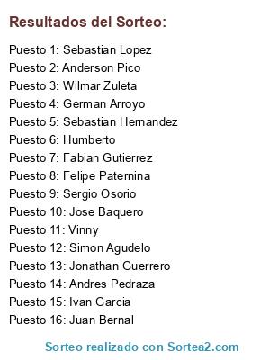 Lista de participantes: Andres Pedraza, Sergio Osorio, Felipe Paternina, Jose Baquero, Fabian Gutierrez, German Arroyo, Wilmar Zuleta, Humberto, Juan Bernal, Sebastian Hernandez, Jonathan Guerrero, Anderson Pico, Vinny, Simon Agudelo, Ivan Garcia, Sebastian Lopez.