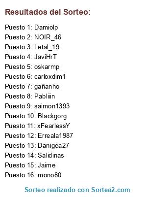 Lista de participantes: Danigea27, Erreala1987, Jaime, Letal_19, mono80, xFearlessY, Blackgorg, Pabliiin, oskarmp, gañanho, Salidinas, Damiolp, NOIR_46, carloxdim1, JaviHrT, saimon1393.