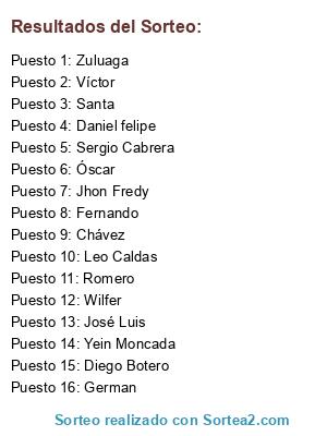 Lista de participantes: Óscar, Chávez, Sergio Cabrera, Jhon Fredy, Santa, Diego Botero, Daniel felipe, Romero, Yein Moncada, German, José Luis, Leo Caldas, Víctor, Zuluaga, Wilfer, Fernando.