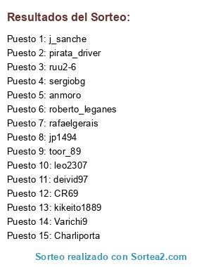 Lista de participantes: leo2307, sergiobg, Charliporta, kikeito1889, toor_89, roberto_leganes, rafaelgerais, j_sanche, jp1494, pirata_driver, Varichi9, anmoro, CR69, ruu2-6, deivid97.