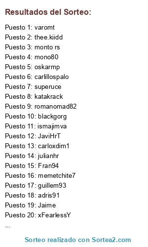 Lista de participantes: jorgetkd, varomt, Jaime, blackgorg, monto rs, JaviHrT, xFearlessY, Ajnoi, mono80, carloxdim1, thee.kiidd, Fran94, guillem93, ismajimva, romanomad82, ega_david, Kolorin, Wolverine_rms, erreala1987, juampi, carlillospalo, memetchite7, Julio, saimon1393, adris91, superuce, emijuansolo, julianhr, oskarmp, Jhojan, max_mayonesa, katakrack.