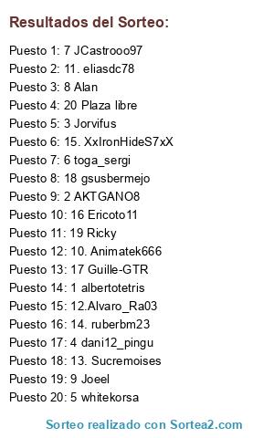 Lista de participantes: 1 albertotetris, 2 AKTGANO8, 3 Jorvifus, 4 dani12_pingu, 5 whitekorsa, 6 toga_sergi, 7 JCastrooo97, 8 Alan, 9 Joeel, 10. Animatek666, 11. eliasdc78, 12.Alvaro_Ra03, 13. Sucremoises, 14. ruberbm23, 15. XxIronHideS7xX, 16 Ericoto11, 17 Guille-GTR, 18 gsusbermejo, 19 Ricky, 20 Plaza libre.