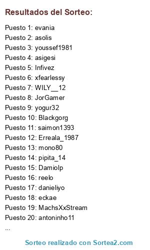Lista de participantes: Erreala_1987, chichovil, evania, noir_46, yogur32, jmtortu, WILY__12, Damiolp, thee.Kiidd, Infivez, wolverine_rms, oskarmp, Papones_23, Bechabe, mono80, Juanka_8, Riera88, whit3shadow, adris91, ega_david, saimon1393, asigesi, julianhr, youssef1981, D3rkl3oN, blea, Blackgorg, chiscoviak, carloxdim1, Kaizher3, asolis, superuce, reelo, Alvaroox16, VaronDandi, max_mayonesa, Mortadela84, xfearlessy, Jaime, pipita_14, SPAJORGE, cao20, AJnoi, problade, Juanillo302, danieliyo, ismajimva, carlillospalo, toño, JorGamer, antoninho11, Iv_Ra_Ma_10, juampi, ghrt3, Julio, rozateclas, MachsXxStream, eckae.