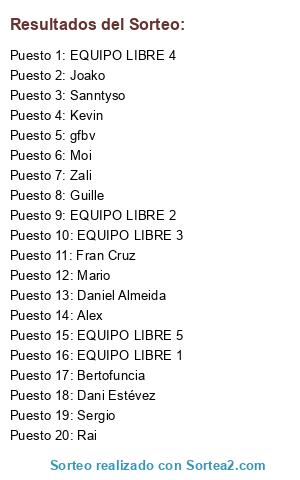 Lista de participantes: Fran Cruz, Guille, Joako, Mario, Bertofuncia, Rai, Sergio, gfbv, Dani Estévez, Kevin, Moi, Daniel Almeida, Zali, Sanntyso, Alex, EQUIPO LIBRE 1, EQUIPO LIBRE 2, EQUIPO LIBRE 3, EQUIPO LIBRE 4, EQUIPO LIBRE 5.