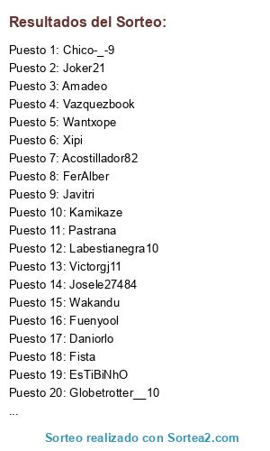 Lista de participantes: Acostillador82, Globetrotter__10, EsTiBiNhO, maskyrojillo, Chico-_-9, Amadeo, Erasemaru, Kamikaze, Fuenyool, Javitri, Labestianegra10, Joker21, Vazquezbook, Wantxope, Fista, FerAlber, Wakandu, Daniorlo, Victorgj11, Xipi, Pastrana, Josele27484.