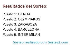 Lista de participantes: ZARAGOZA, GENOA, SEVILLA, BARCELONA, INTER MILAN, OLYMPIAKOS.